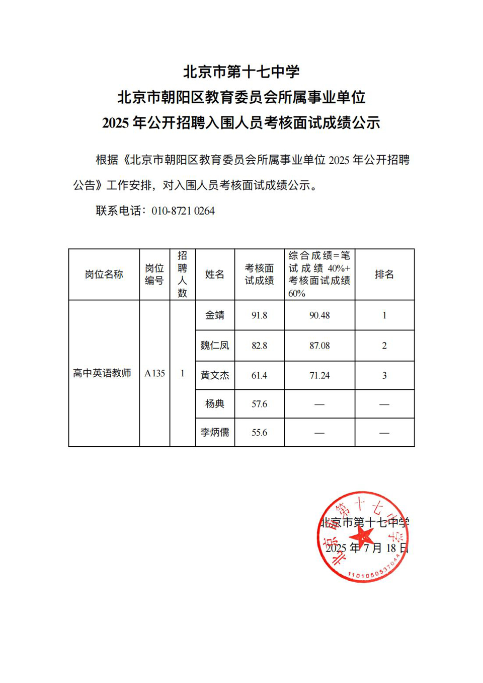 北京市第十七中学2025年公开招聘入围人员考核面试成绩公示